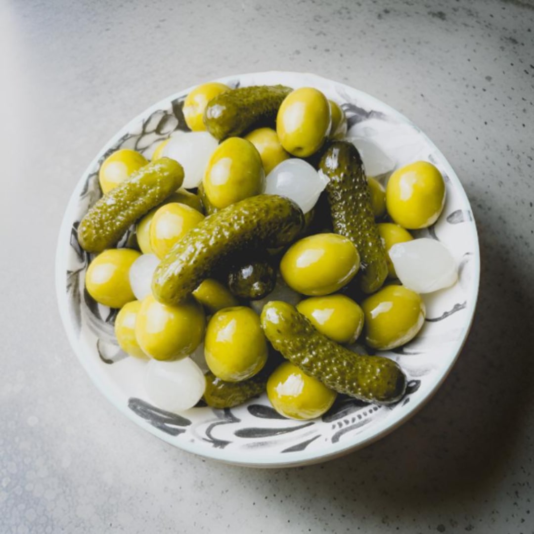 It is a mix of various pickled items, including green olives, black olives, pearl onions, and gherkins. Everything is seasoned with a very mild vinegar and lemon dressing.