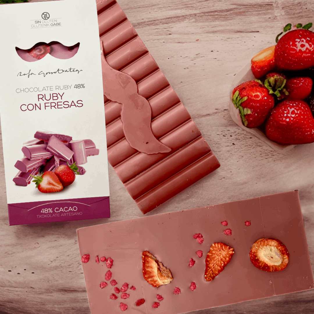 The Ruby Chocolate with Dried Strawberries is a handcrafted ruby chocolate with 48% of the best cocoa, boosted with strawberries and rose petals. Crafted by the renowned pastry chef Rafa Gorrotxategi, it is a Spanish delicatessen made with top quality and natural ingredients, resulting in an exquisite chocolate packaged in a way that also makes it ideal for gifting.