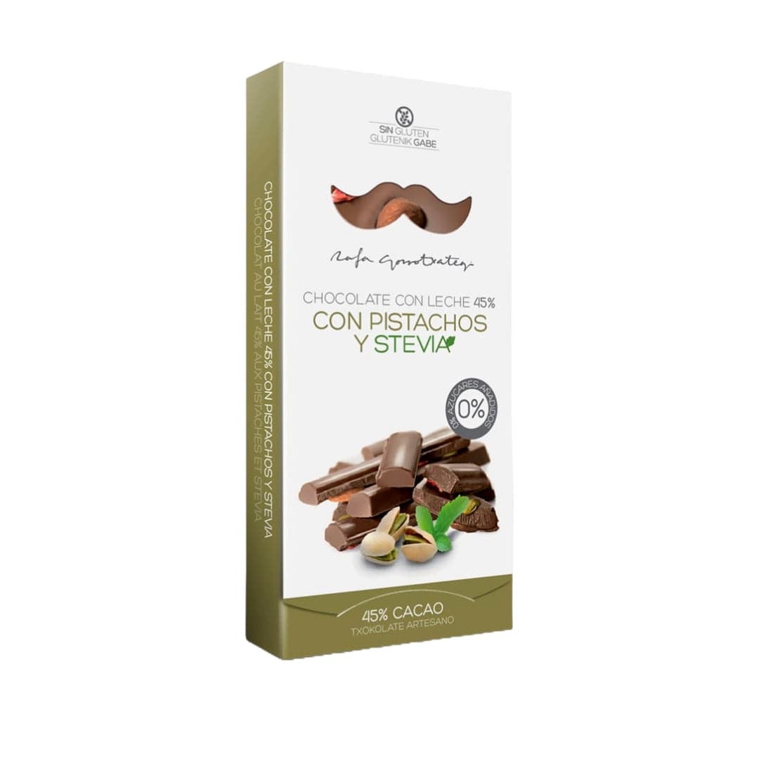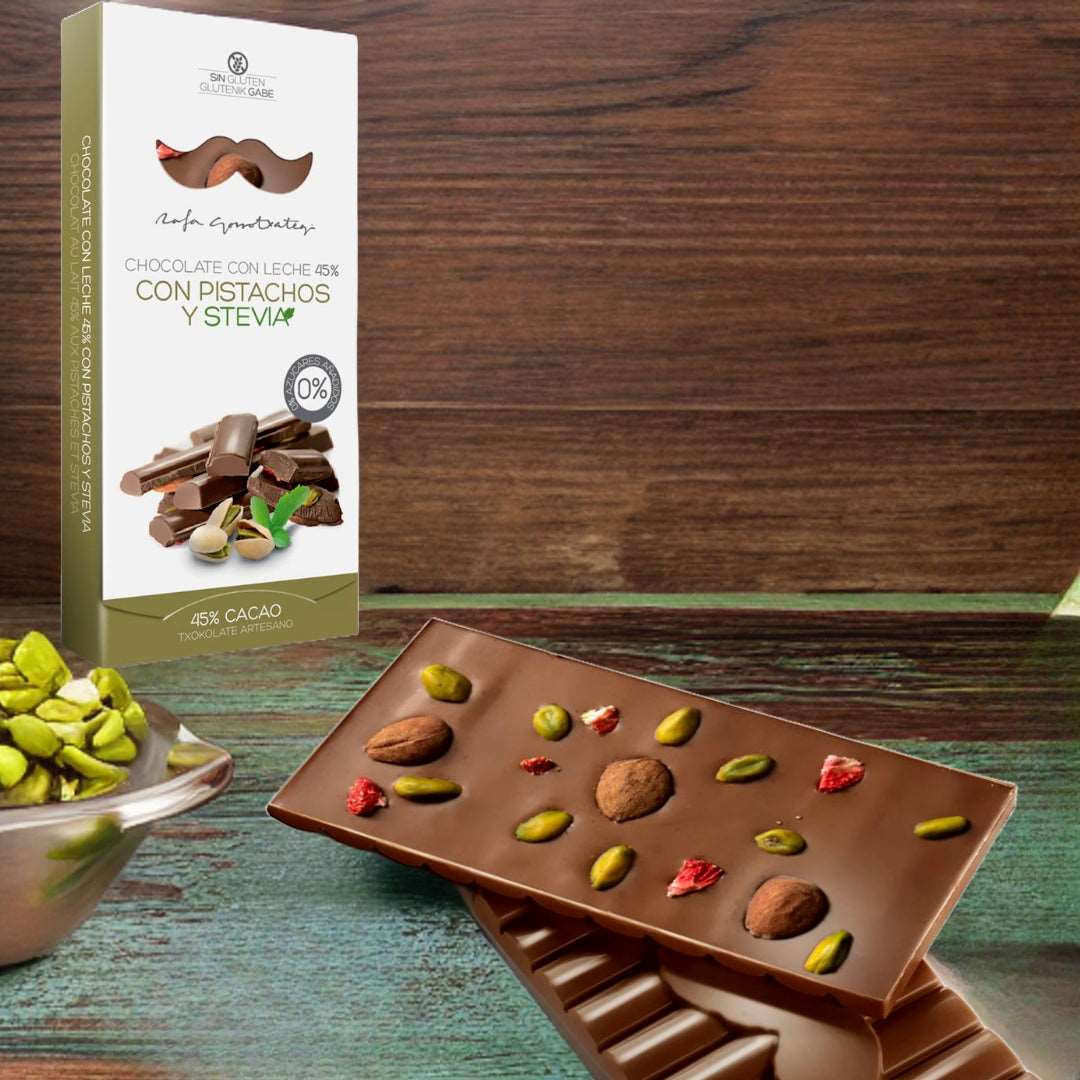 The Pistachio & Stevia Milk Chocolate by Rafa Gorrotxategi is a delicious gourmet chocolate bar handcrafted with 45% of the best cocoa, sweetened with stevia, without added sugar, with pistachios, almonds and natural freeze-dried strawberries of first quality.
