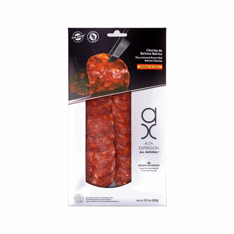 One of the most popular Spanish cured meats, it is a staple on any Spanish charcuterie board! This Sliced Chorizo Ibérico Bellota is made from the meat of Ibérico pigs, which roam freely in the dehesa and are fed acorns during the montanera season. The result is a spectacular sausage, one of our favorites.