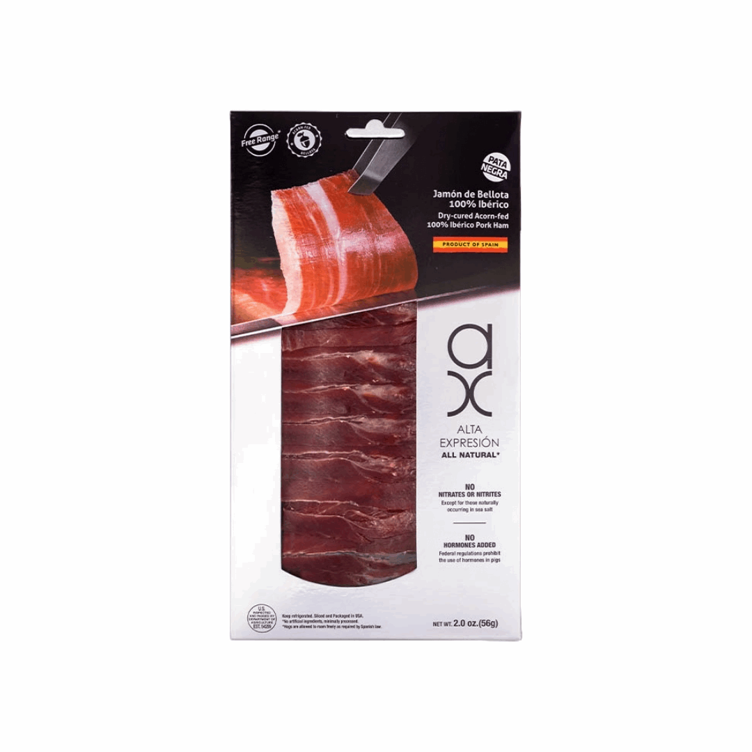 Expertly cured by seasoned artisans, the thinly sliced Iberian ham showcases the unparalleled quality of Jamon Pata Negra, the most gourmet product of the Spanish cured meats.